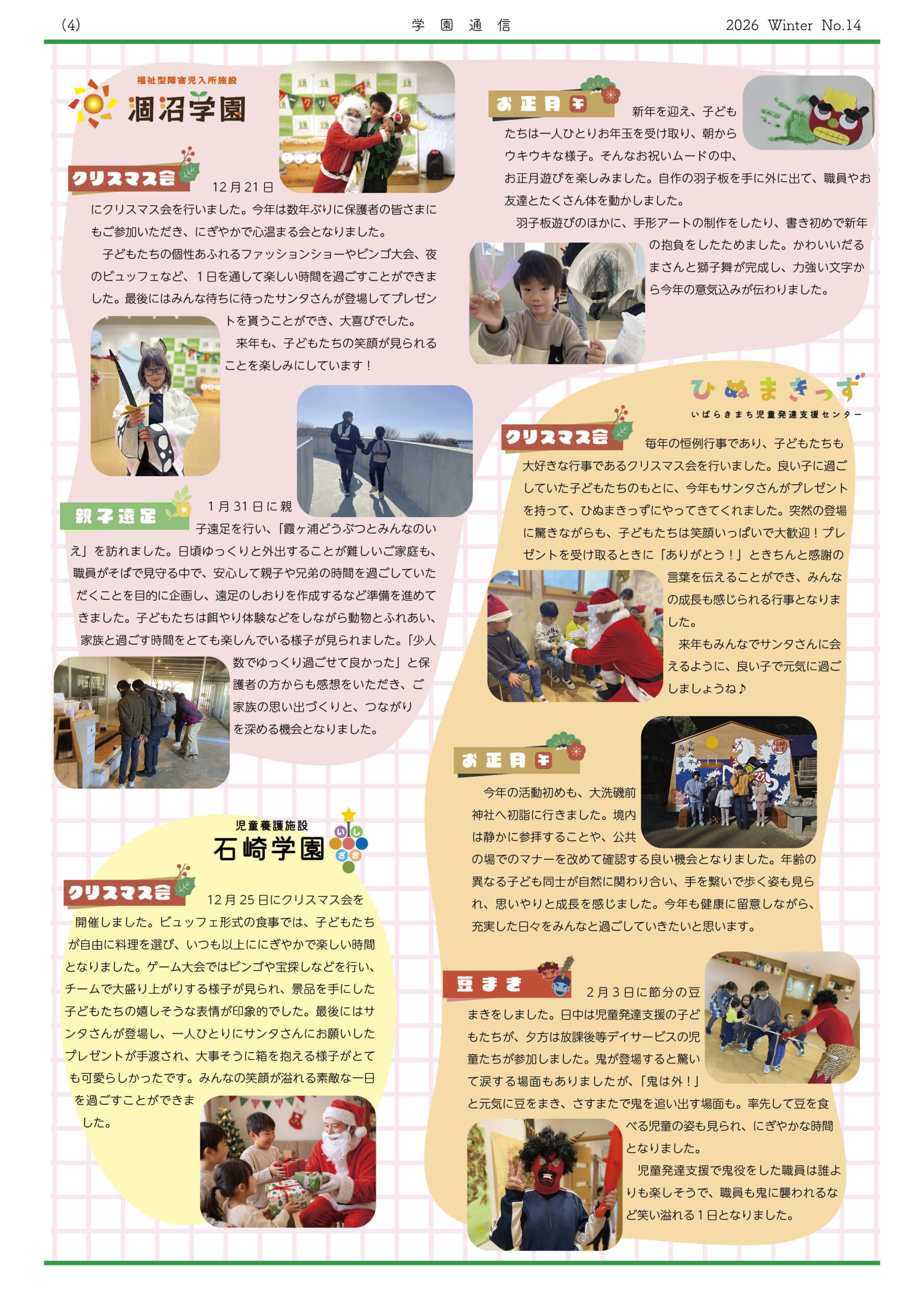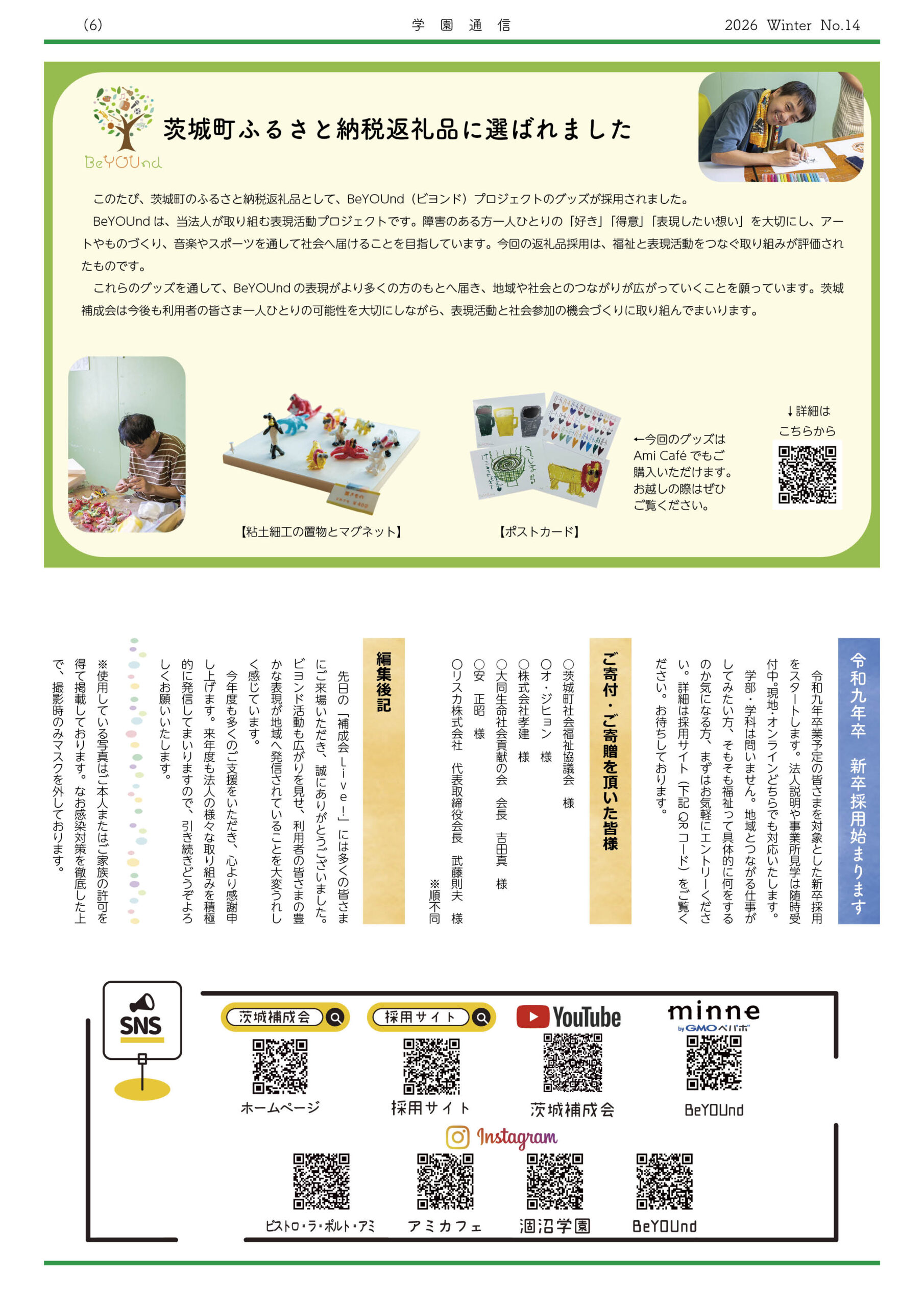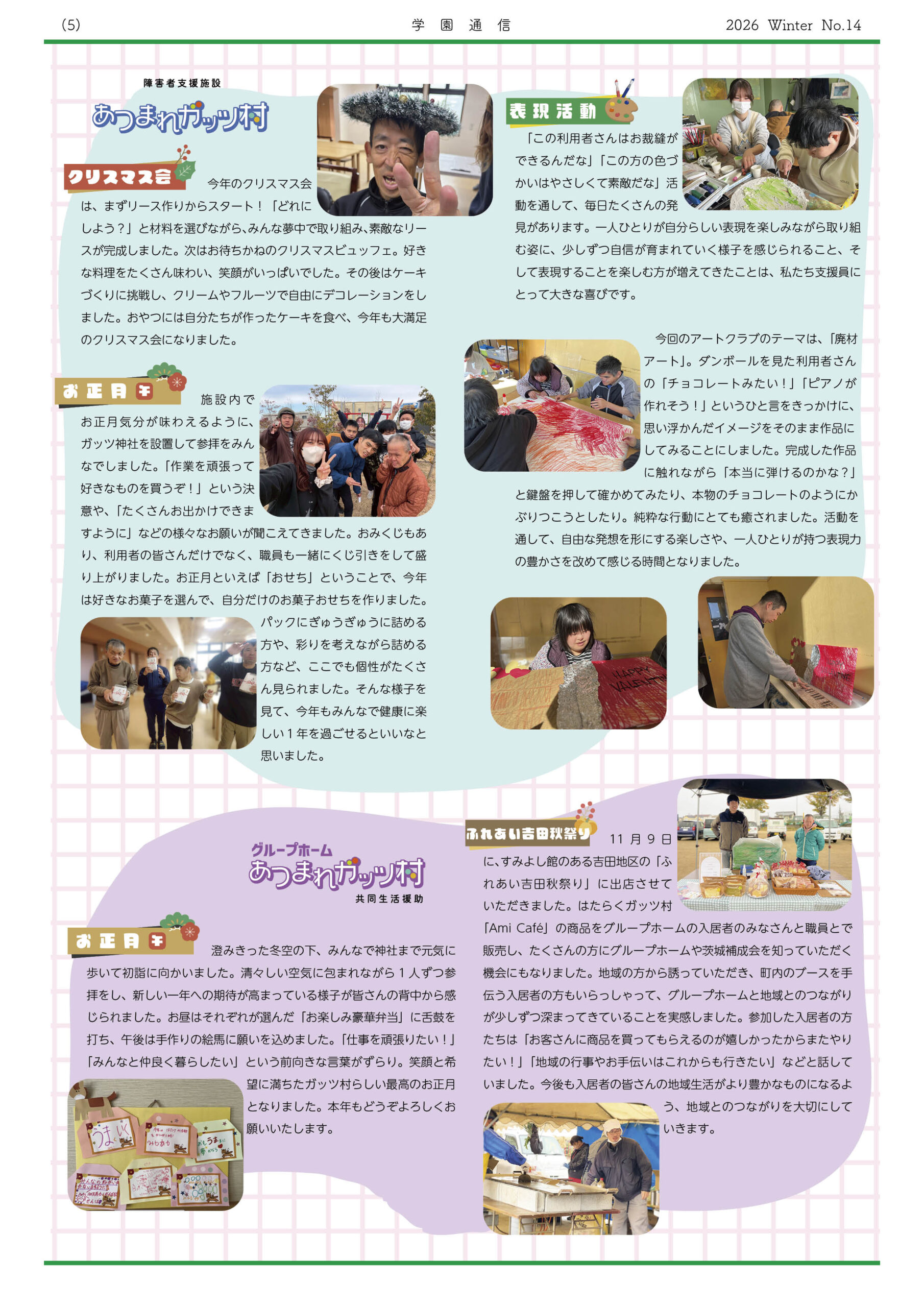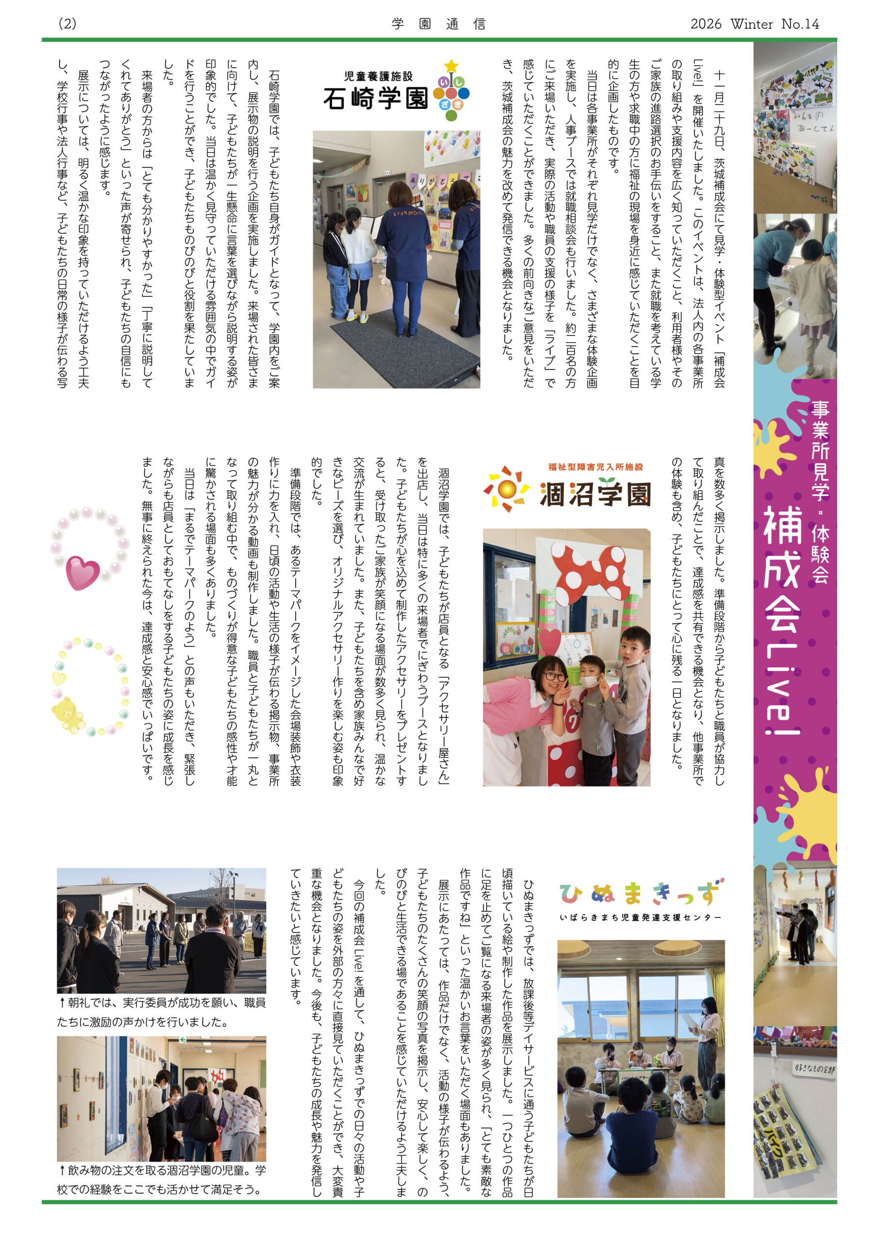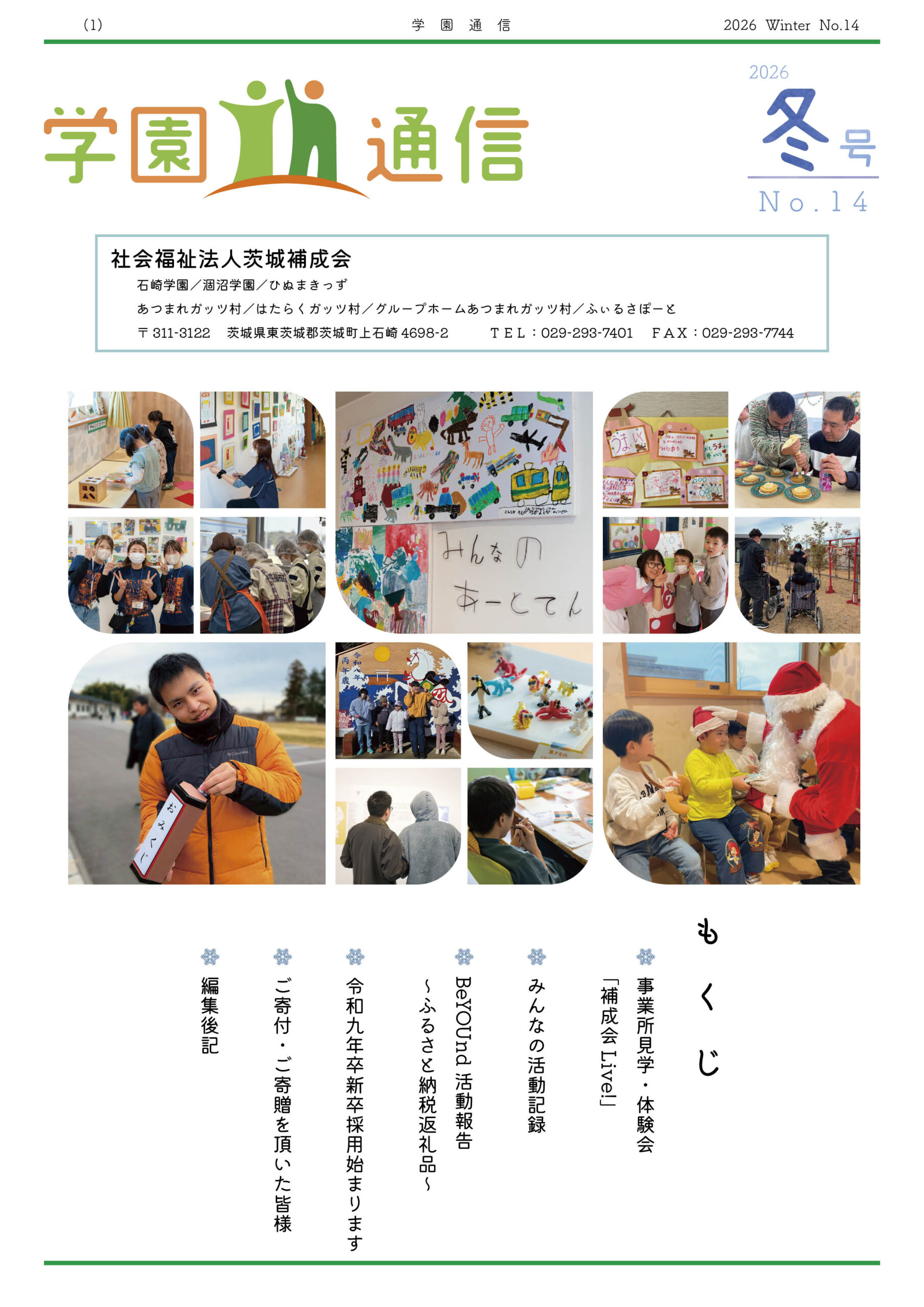 「学園通信」冬号を発行いたしました。 今回は事業所見学体験会「補成会Live!」の様子をお届けいたします♪ ぜひご覧ください。