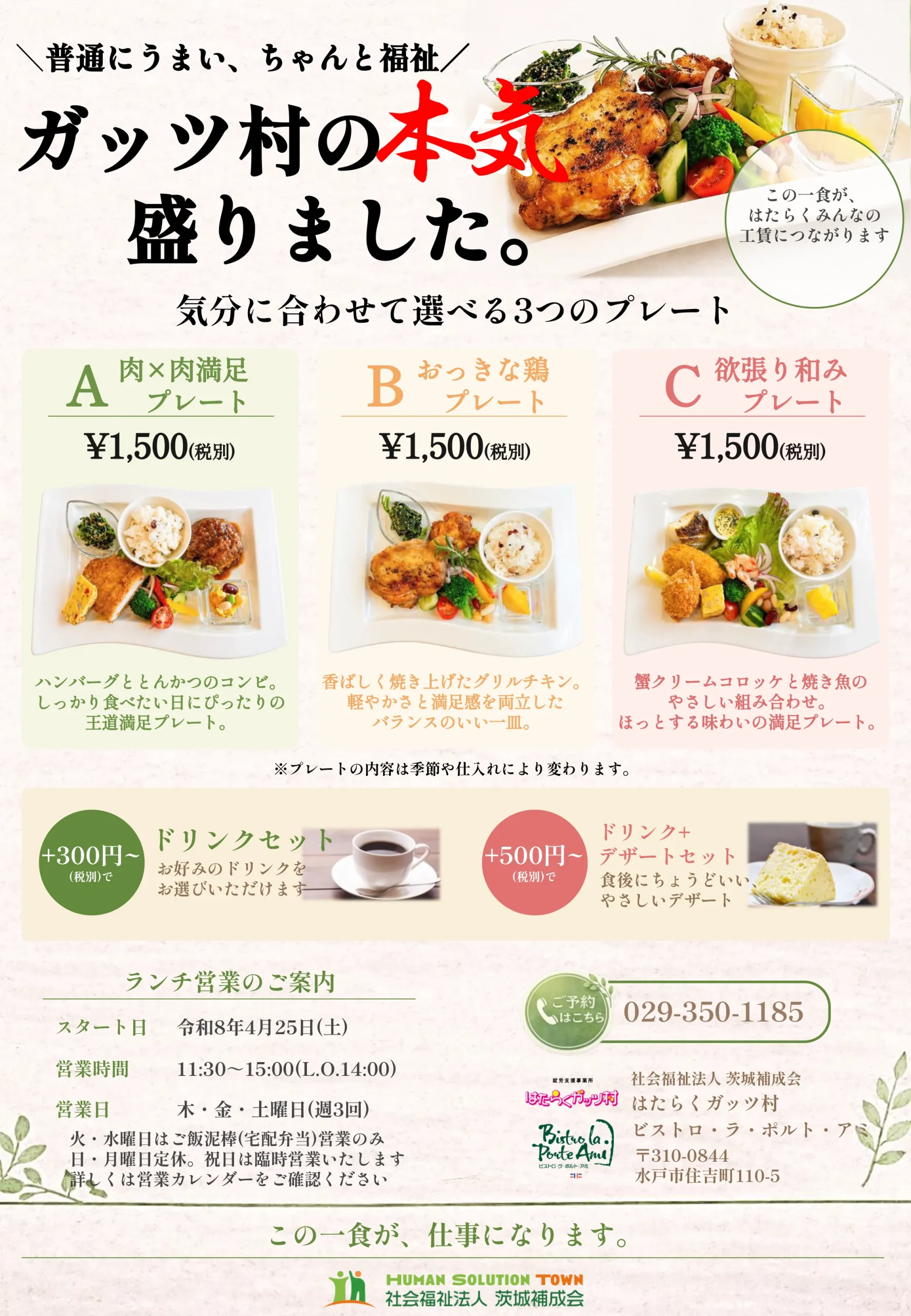 はたらくガッツ村のメンバーたちが手をかけて作った一皿を、誰かのいつものお昼に。それが、私たちの目指す新しいかたちです。